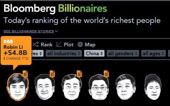 凤凰科学科技讯 北京时间12月4日,据彭博社报道,14天前,百度CEO李彦宏登上了中国富豪榜第二名,而根据彭博亿万富翁指数(Bloomberg Billionaire Index)的数据,李彦宏已经以122.31亿美元的身价,超越大连万达董事长王健林成中国内地新首富。娃哈哈主席宗庆后以120亿美元净资产紧随李彦宏、王健林。腾讯创始人兼主席马化腾位列第四,净资产为115亿美元。