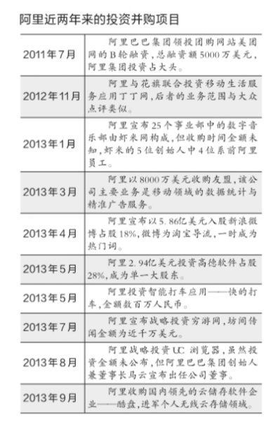 在2011年之前,阿里巴巴集团几乎从未参和过投资并购,但随着2011年7月,阿里巴巴投资团购网站美团网后,突然发力先后投资或收购了丁丁网、虾米音乐、友盟、新浪微博、高德、快的打车、穷游网、UC浏览器、酷盘等10多家公司,总涉及金额超出10亿美元。(见附表)