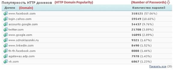 在该服务器窃取的账号登录密码中,之中来自Facebook网站的密码占了多数,共318121个,占到总量的57%;雅虎59549个、约占11%占;谷歌54437个、约占10%。被盗密码中,还包括来自LinkedIn和俄罗斯两大社交网站VKontakte和Odnoklassniki的用户口令。此外,这一僵尸网络还盗取了一些FTP、远程桌面和secure shell账户细节。