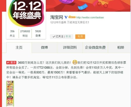 据称,淘宝此次“包圆”彩票的二维码一分钟内被扫描了20万次。抢到第一注彩票的是辽宁沈阳的用户。凌晨一点钟,扫走彩票的用户达到100万。不到一天时间,1772万注双色球彩票就被网友们全部领完。而1个普通线下投注站每月大概能卖出2.5万张彩票,1772万注彩票需在100个投注站用7个月才能卖完。