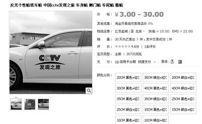 一家网店出售“CCTV车贴”,30天内售出3件。 网络截图