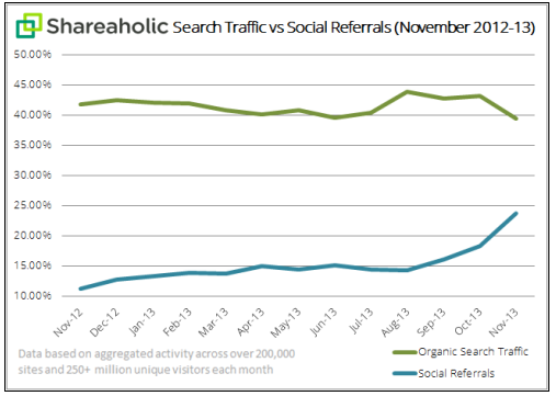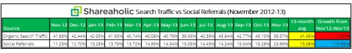 对比发现,2012年11月份,搜索引擎的有机流量份额为41.83%,社交媒体流量为11.23%,但到了本年11月份,搜索引擎的有机流量份额为39.37%,而社交媒体流量增加为23.69%。